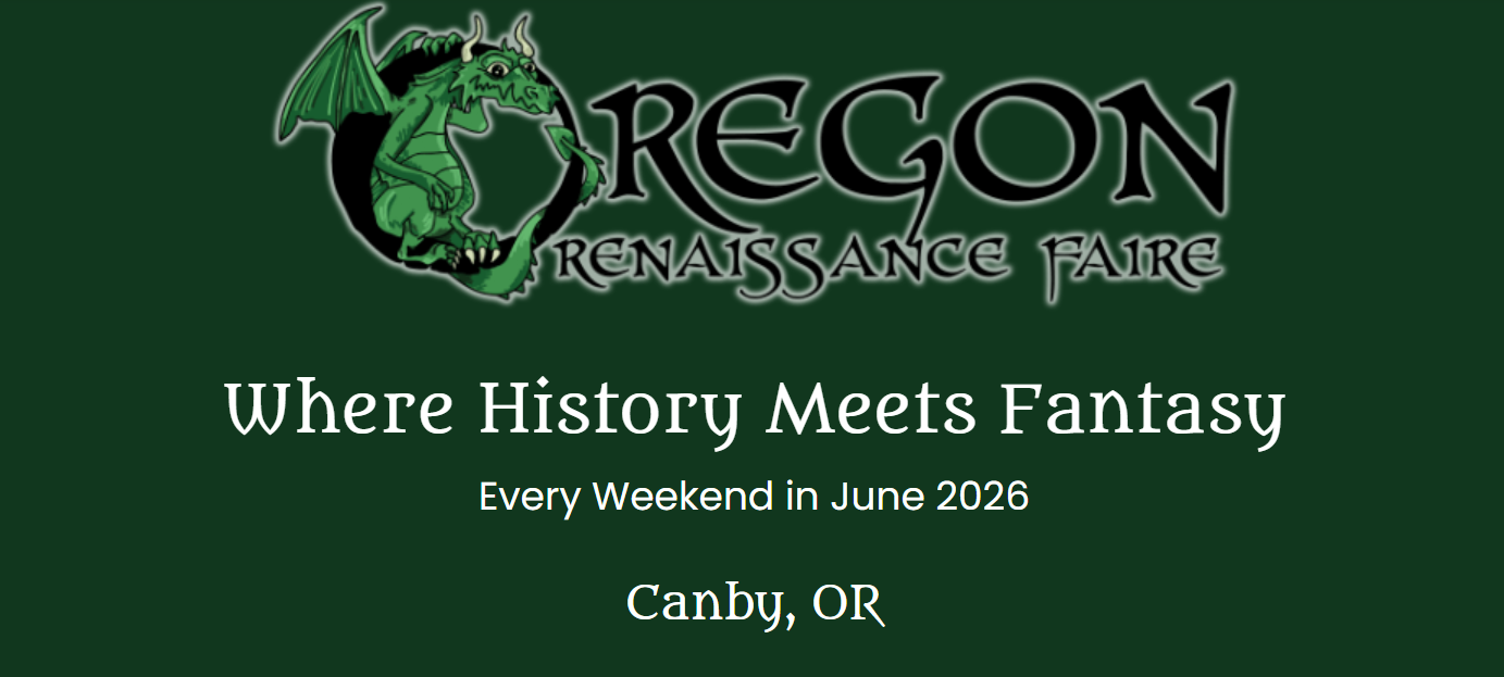 Oregon Ren Faire Saturday, June 6, 2026 10:00 AM Sunday, June 28, 2026 7:00 PM Google Calendar ICS It is our first year vending at Oregon Renaissance Faire and we cannot be more thrilled to join the market in the woods. We will be bringing the whole catalog of our collection with many options to choose from! See you in June!