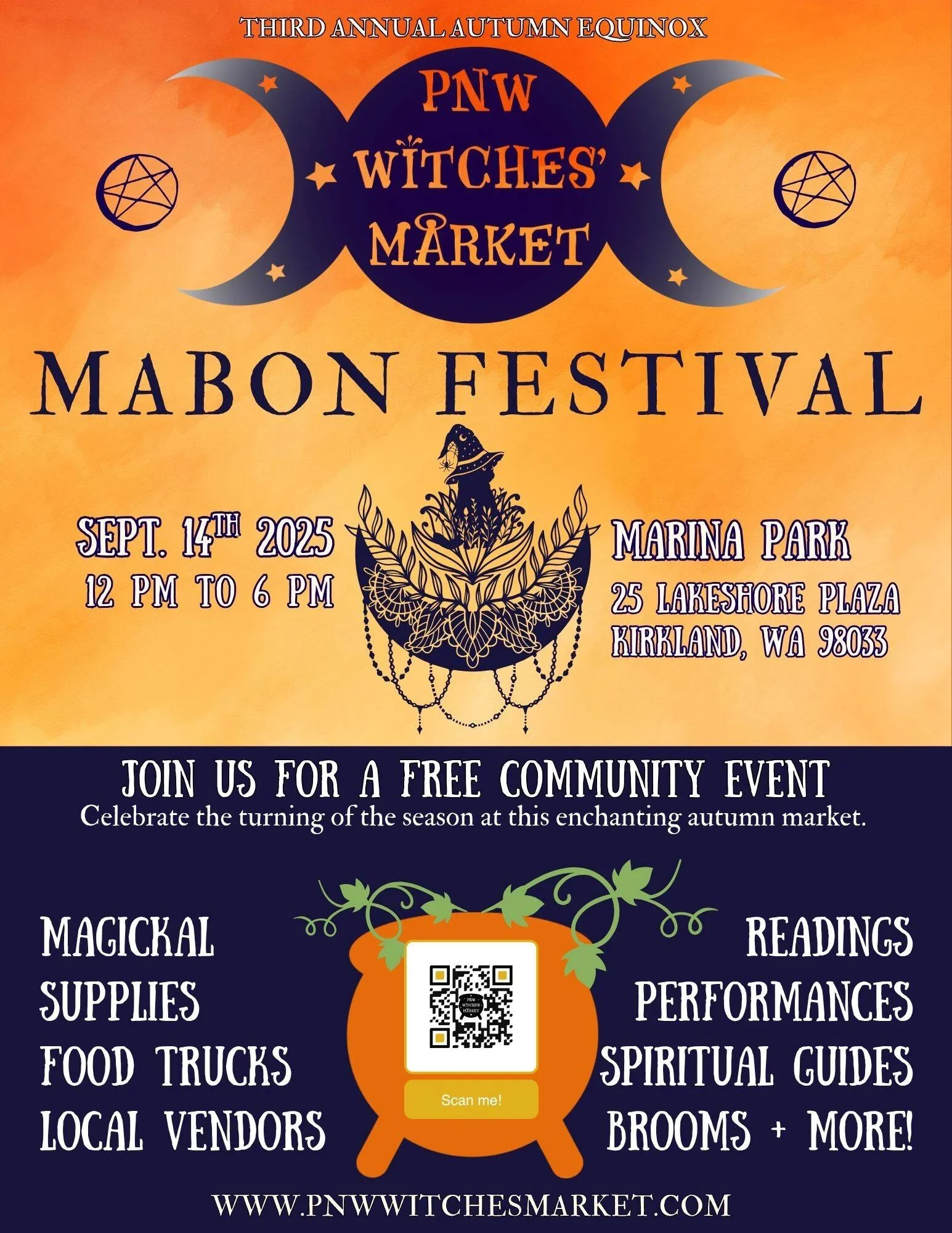 Back to All Events PNW Witch's Market: Mabon Festival Sunday, September 14, 2025 12:00 PM 6:00 PM Marina Park 25 Lakeshore Plaza Kirkland, WA, 98033 United States (map) Google Calendar ICS Join the FREE community event to celebrate the turning of the season from summer to autumn! Vendors of all kinds to enchant the senses, food trucks, and a celebration of Mabon!